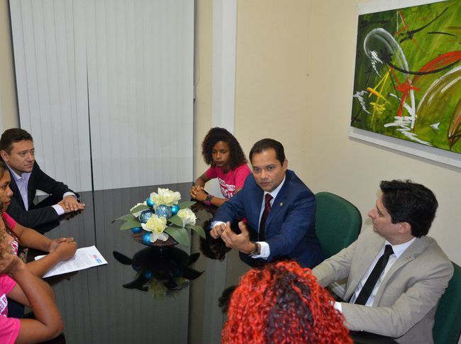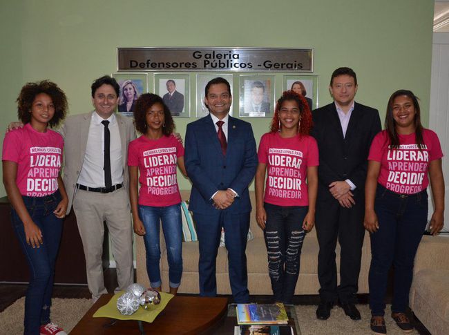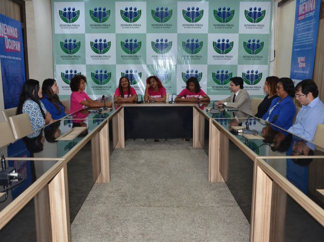 Acompanhadas pelas representantes da Plan, Gezyca da Silveira e Dalvijane Lima, as “defensoras públicas por um dia” Amanda Cristina Rodrigues, 18 anos, Brenda Pereira, 17, Ludmiria Ayres Freitas, 15, e Lauanda Vitória Rodrigues, 14, foram recebidas pelo subdefensor-geral do Estado, Emanuel Pereira Accioly, na sala de reunião do Conselho Superior. Também participaram do encontro, a defensora Lindevania Martins Silva, titular do Núcleo de Defesa da Mulher/LGBT, o defensor Benito Pereira Filho, titular do Núcleo do Idoso, da Pessoa com Deficiência e da Saúde, que ora responde pelo Núcleo de Direitos Humanos (NDH), e a superintendente do 1º Atendimento, Cleudes Lima. Todos falaram sobre sua experiência e missão no aprimoramento da política pública de acesso à Justiça no estado.
