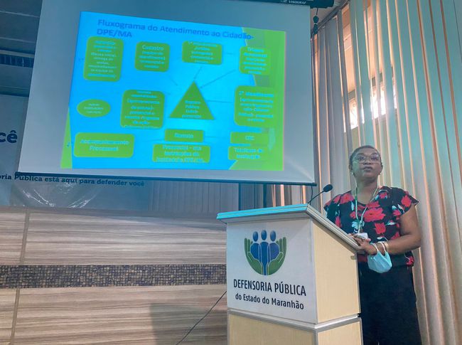 No primeiro dia de atividades do curso, também foram ministrados mais dois módulos. Um deles teve como facilitadora a supervisora do Primeiro Atendimento da DPE na capital maranhense, a psicóloga Cleudes Cristina Lima. Com base em estudos e na experiência diária à frente da recepção dos assistidos, a servidora abordou o tema “Fluxo do atendimento presencial nos Núcleos da Defensoria Pública do Maranhão”.