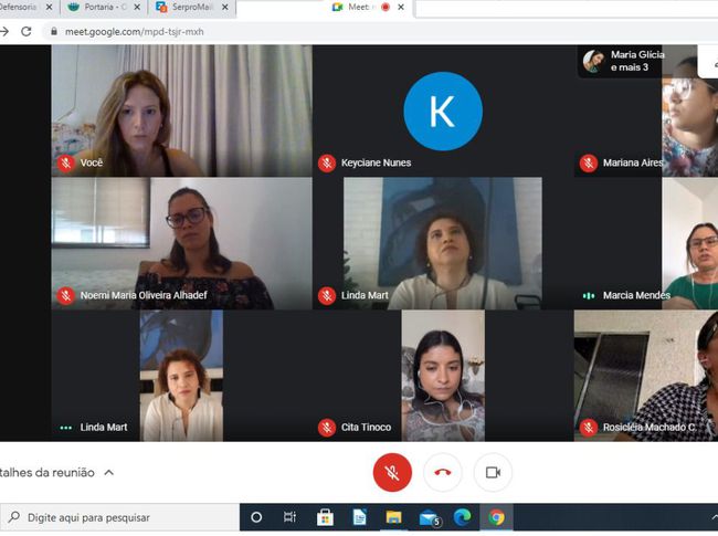 O Núcleo de Defesa da Mulher e População LGBT realizou, na manhã desta segunda-feira (08), reunião virtual de alinhamento contando com a participação das defensoras públicas Lindevania Martins e Jaqueline Sampaio, as assistentes sociais Rosicléia Costa e Natalia Tinoco , a psicóloga Márcia Mendes, a assistente administrativa Noemy Alhadef e os estagiários Pedro Henrique, Millany Freire, Mariana Aires, Laura Figueiredo, Maria Glicia Queiroz e Keyciane Nunes.