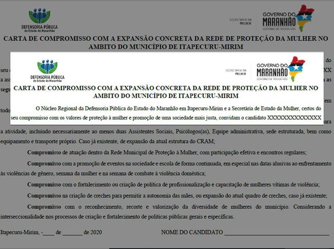 Atentas ao processo eleitoral e interessadas em contribuir com o aperfeiçoamento das políticas públicas voltados à proteção dos direitos da mulher, no município de Itapecuru-Mirim, a Defensoria Pública do Estado (DPE/MA) e a Secretaria de Estado da Mulher (Semu) encaminharam cartas de compromisso solicitando o empenho dos candidatos à Prefeitura da cidade, na expansão da rede municipal de proteção ao segmento, se eleitos forem. Dos quatro candidatos, três já assinaram o documento, comprometendo-se a combater a violência e promover o acesso aos direitos fundamentais das mulheres.