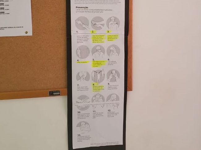 Além disso, também foi também afixado no mural do núcleo um aviso com informações e ilustrações sobre o vírus, as formas de contágio e procedimentos individuais e coletivos de prevenção.