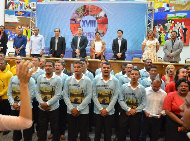 A solenidade de abertura da XIII Semana do Encarcerado, promovida pelo Governo do Maranhão, por meio da Secretaria de Administração Penitenciária (Seap), foi prestigiada por diversas autoridades, dentre elas, o subdefensor-geral do Estado, Emanuel Pereira Accioly. O ato solene, que ocorreu na Assembleia Legislativa, foi conduzido pelo secretário da Seap Murilo Andrade e contou com apresentações de corais de internos e lançamento de uma marca própria de roupas produzidas por reeducandas do sistema prisional feminino.