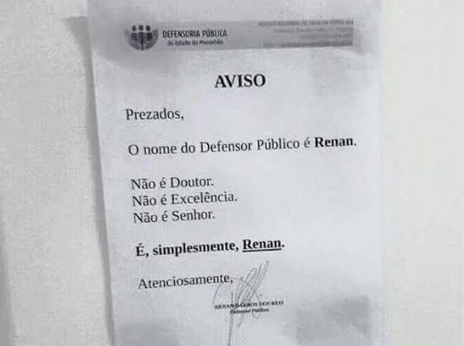 Um aviso colado na porta do seu gabinete por um Defensor Público de Lago da Pedra, a 305 km de São Luís, chamou a atenção nas redes sociais. O comunicado diz: “O nome do Defensor Público é Renan. Não é Doutor. Não é Excelência. Não é Senhor. É, simplesmente, Renan”. A postagem teve mais de 1,4 mil compartilhamentos.