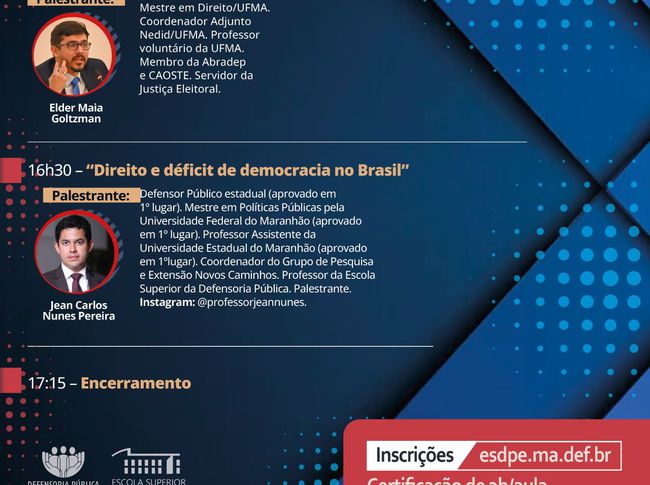 Encerrando a programação, o defensor público Jean Carlos Nunes Pereira, que ainda é coordenador do Grupo de Pesquisa e Extensão Novos Caminhos e professor da Esdpe, tratará do tema "Direito e déficit de democracia no Brasil".