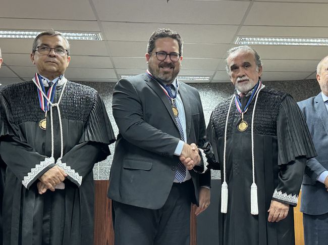 O defensor público-geral do Estado, Gabriel Furtado, foi agraciado com a Medalha do Mérito Eleitoral Ministro Arthur Quadros Collares Moreira, nesta terça-feira (30), em sessão especial no Tribunal Regional Eleitoral do Maranhão (TRE-MA). A condecoração, proposta pelo presidente da Corte, des. José Luiz Oliveira de Almeida, e pelo corregedor Regional Eleitoral, des. José Gonçalo de Sousa Filho, é resultado do reconhecimento aos relevantes serviços prestados pelo homenageado, ao longo dos seus 15 anos de carreira na Defensoria Pública do Maranhão (DPE/MA), além da parceria institucional na promoção do acesso a direitos, democracia, cidadania e inovação no âmbito da justiça.