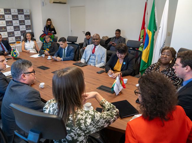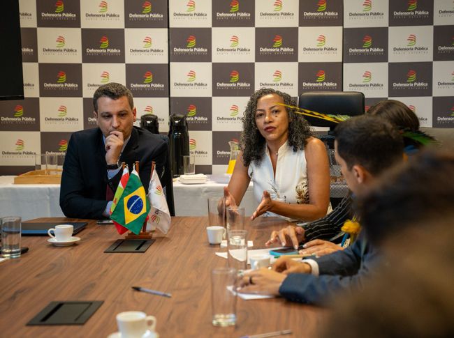 Em seguida, a ouvidora Naisandra Mota participou, junto com a ministra Macaé Evaristo, de uma reunião com os ouvidores Maria Aparecida Caovilla, presidenta do Conselho Nacional de Ouvidorias de Defensorias Gerais-Externas das Defensorias Públicas, Tamikuã Pataxó, da Defensoria Pública da Bahia, Gleidson Dias, da Defensoria Pública da União, e Thiago Oliveira, da Defensoria Pública do Piauí, além da administração superior e defensores(as) públicos(as) da DPE/SC. O encontro, conduzido pelo defensor público-geral em exercício, Thiago Burlani Neves, e pela ouvidora-geral Maria Aparecida Caovilla. O encontro possibilitou à ministra conhecer a atuação dos núcleos, que desenvolvem trabalhos voltados a diferentes áreas da defesa de direitos, incluindo mulheres em situação de violência, população LGBTQIA+, idosos, pessoas com deficiência, imigrantes e refugiados, além de políticas de acolhimento, educação em direitos e mutirões de atendimento.