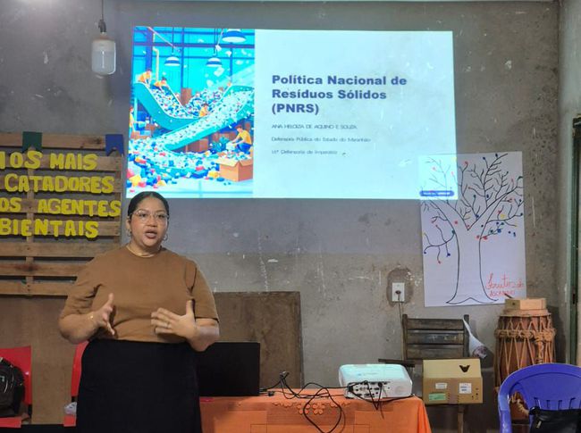 A Defensoria Pública do Estado do Maranhão (DPE/MA) realizou, nesta sexta-feira (18), o seminário "Leis de Resíduos Sólidos: Conceitos Introdutórios", em Imperatriz. O evento, ministrado pela defensora pública Ana Heloíza de Aquino, reuniu catadores, lideranças comunitárias e representantes de órgãos parceiros no Galpão da Associação dos Catadores de Materiais Recicláveis de Imperatriz (Ascamari) e reforça o compromisso da instituição com a sustentabilidade e a justiça social.