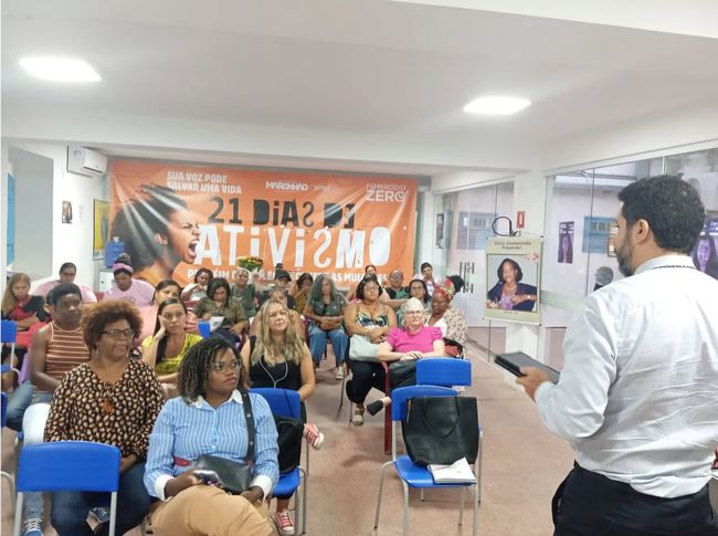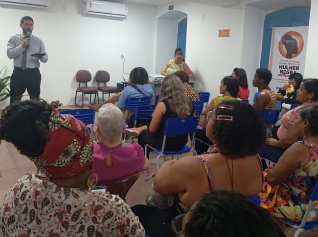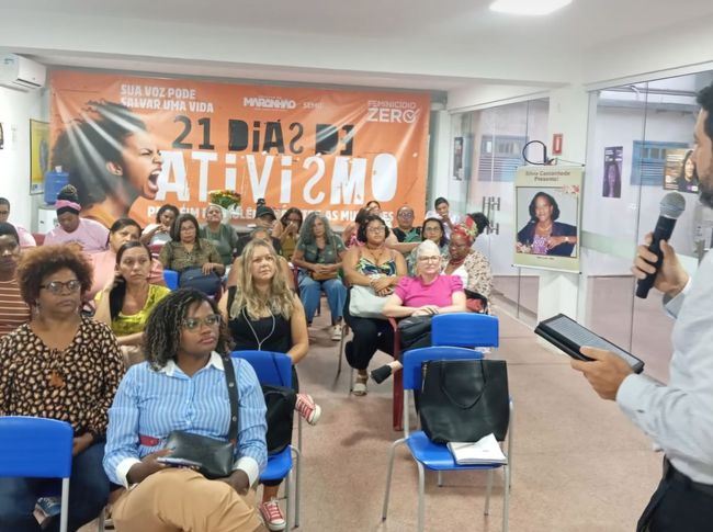 A Defensoria Pública do Estado do Maranhão (DPE/MA), por meio do Núcleo de Defesa da Mulher, participou do I Curso de Formação para Lideranças Comunitárias, desenvolvido pela Secretaria de Estado da Mulher (SEMU). O defensor público Bruno Antônio Barros Santos, titular do Núcleo, palestrou e participou de uma roda de conversa com diversas lideranças comunitárias, no dia 4 de dezembro, na sede do Centro Estadual de Referência da Mulher Negra, sobre masculinidades, patriarcado, misoginia, interseccionalidades e machismo estrutural, em referência à campanha do Laço Branco.