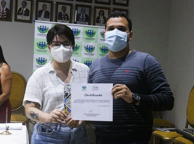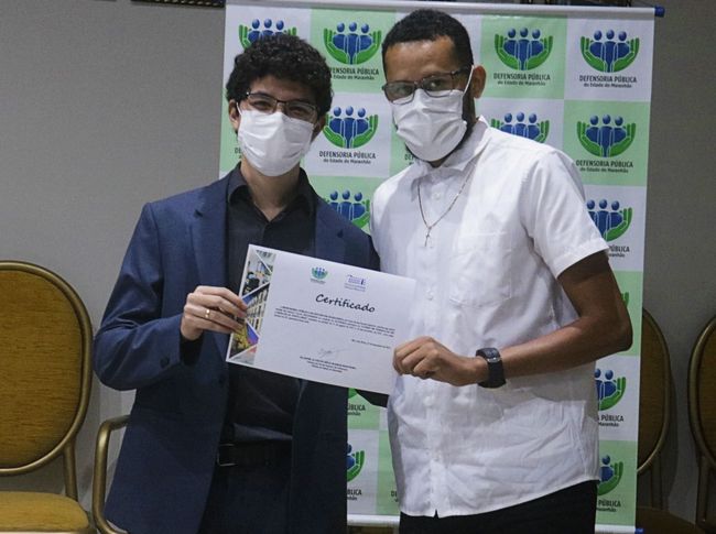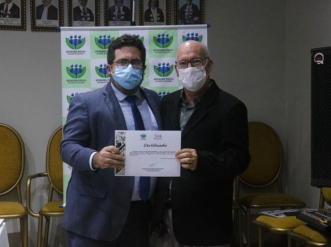 A solenidade de entrega de certificados foi conduzida pelo subdefensor-geral Gabriel Furtado, acompanhado dos defensores públicos Camila da Fonseca Bonfim e Adriano Oliveira da Silva Junior.