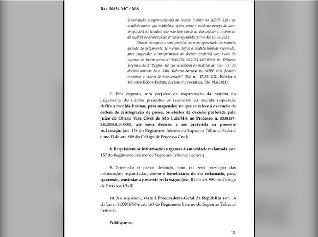Decisões judiciais - No caso do STF, a medida liminar, decorrente da reclamação constitucional nº 50.154, foi deferida pela ministra Carmem Lúcia, suspendendo a decisão do juiz que determinou a retirada dessas famílias das terras que ocupam as margens da BR-135. A reintegração de posse deveria ser cumprida na manhã desta terça-feira (26).