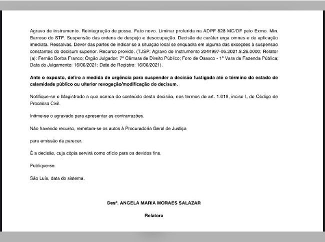 Paralelamente, a Defensoria Pública manifestou-se no Agravo de Instrumento de nº 0818452-74.2020.8.10.0000, no âmbito do TJMA, com o mesmo intuito de garantir a permanência das famílias no local, obtendo decisão favorável proferida pela desembargadora Ângela Salazar.